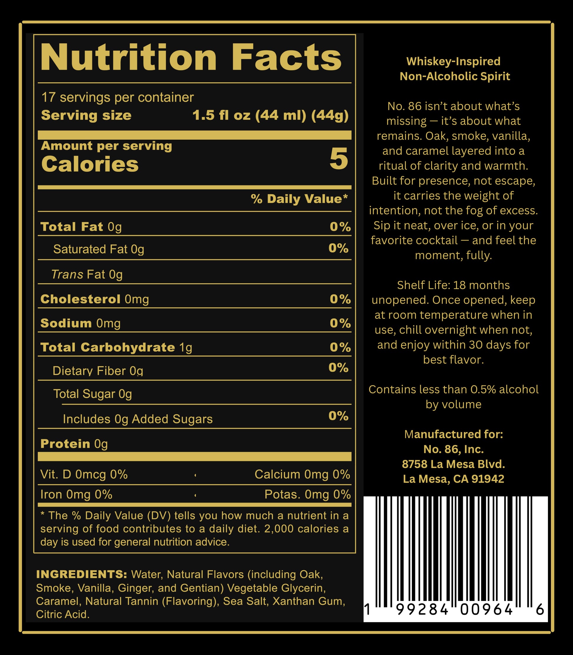 Built with layered oak, warm spice, and a slow, controlled finish, No. 86 is designed to be sipped, not rushed. It delivers the familiar weight, warmth, and structure of whiskey — without intoxication or compromise.